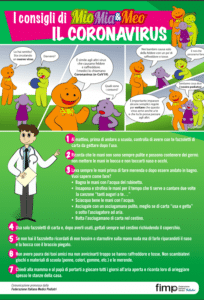 Covid19 però è più astuto e più veloce, ama passare da una persona all’altra per questo hanno chiuso le scuole e i cinema e i teatri. Ma ha anche un punto debole: è uno zozzone, preferisce annidarsi nelle goccioline che produciamo quando tossiamo e starnutiamo, per questo è importante in questi momenti coprirsi bene la bocca e il naso e bisogna lavarsi bene le mani.